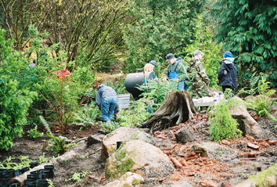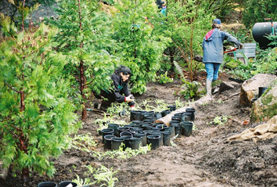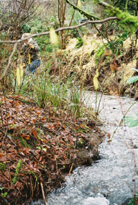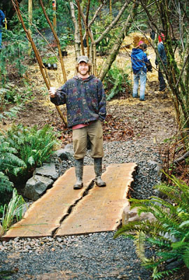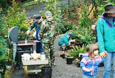 We purchased the land across the drive from the nursery that borders Fields Creek . . . this doubles the size of our nursery, and gives us some remarkable habitat to reclaim. With a grant from OWEB and the help of SOLV and so many other volunteers, we have restored the stream. We removed invasive newcomers along the creek that were crowding out our natives, and replanted with a variety of native trees, shrubs, ferns and perennials. Now the creek can resume its role as essential habitat for Red Legged Frogs (a threatened species), salamanders, Golden Mantle Squirrels, native Cutthroat Trout, Douglas Squirrels, deer, and a wide variety of birds, butterflies and dragonflies. In addition, the water that enters the stream will be filtered naturally by the streamside plantings.