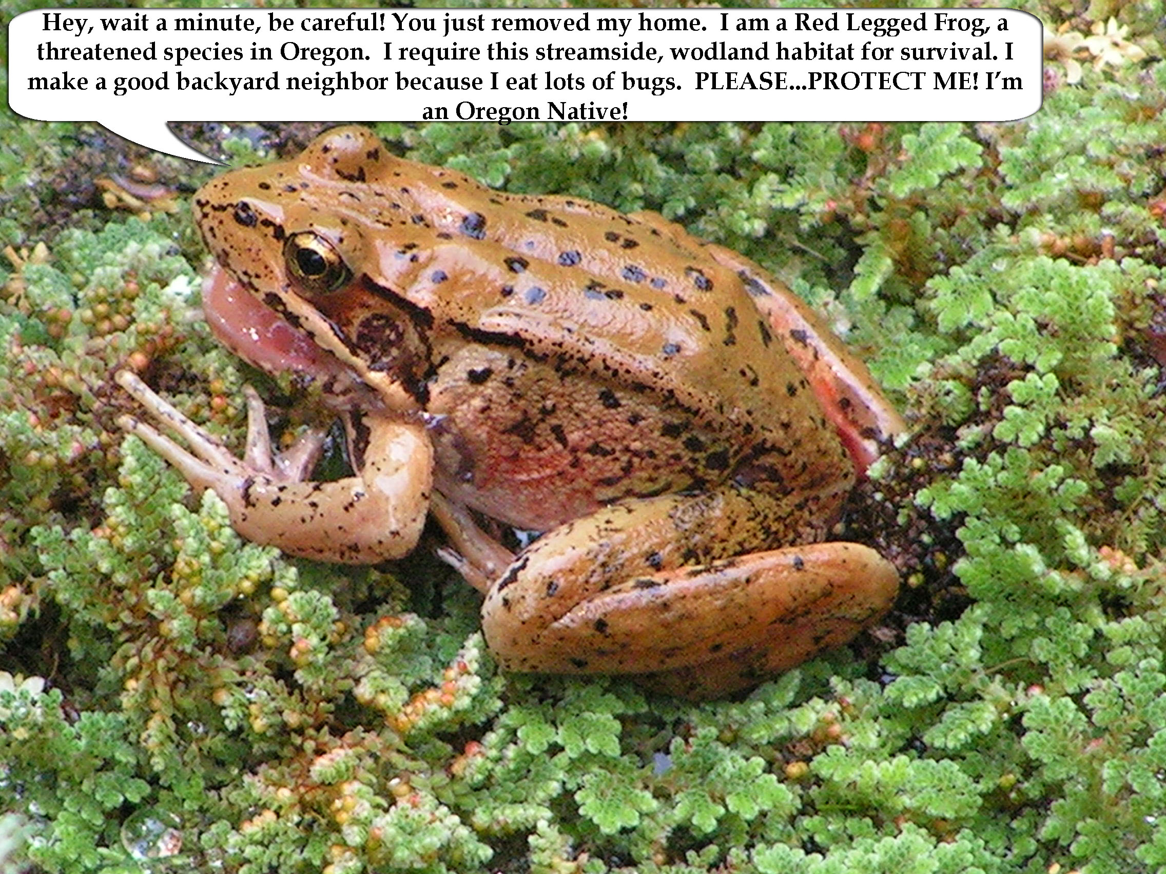 The Unheard Voice! Red Legged Frogs can only be heard under water. You can't hear them unless you are a frog. Now listen carefully, or someday you may no longer have the opportunity. "I am a Red Legged Frog, a threatened native species in Oregon. I represent the unheard voice of the Friends of Fields Creek and the wildlife that reside here. We require this streamside, woodland habitat for survival. Much of our habitat has been removed by people to build homes. When they build their homes, our homes are destroyed. We thought that we would be safe if we lived next to the stream. PLEASE PROTECT US by preserving Field's Creek."